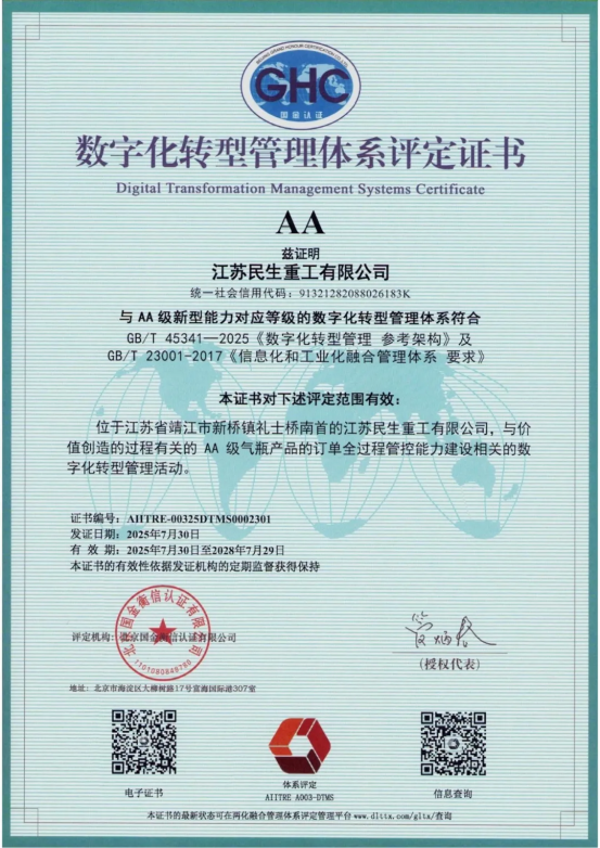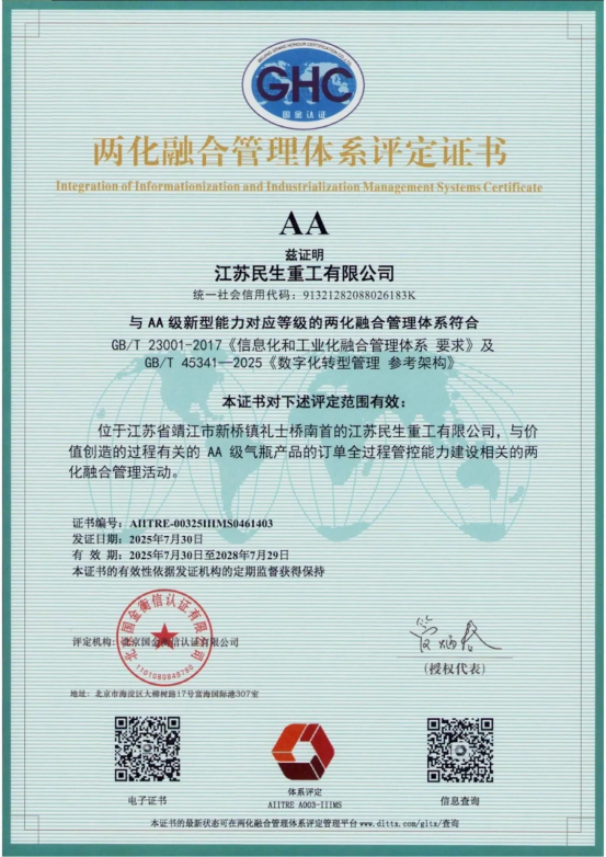 近日,江蘇民生重工有限公司(以下簡稱“民生重工”)順利通過了工業(yè)和信息化部兩化融合管理體系評定工作委員會的審核,榮獲《兩化融合管理體系AA級評定證書》及《數(shù)字化轉型管理體系AA級評定證書》。此次雙認證標志著民生重工在智能制造與信息化深度融合領域實現(xiàn)里程碑式突破,為民生重工數(shù)字化轉型和管理體系的提質增效提供了實踐范本。